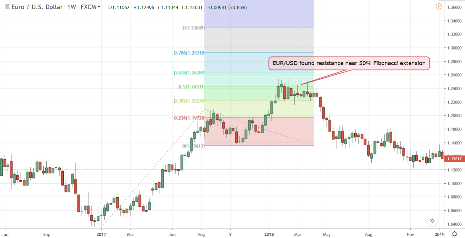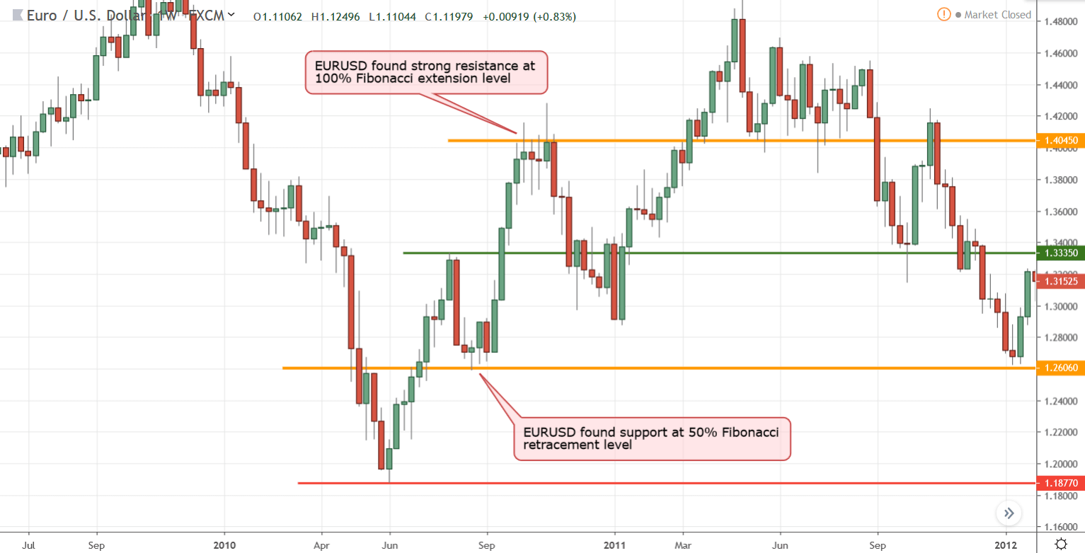 In figure 3, we can see the plotted the 50% Fibonacci retracement level seen in figure 2, where the EURUSD found support during a bearish retracement and reversed. We can also see that after reaching the 100% Fibonacci extension level, the EURUSD uptrend found major resistance and failed to close above this level. After several tries, the bulls gave up and the uptrend ended.