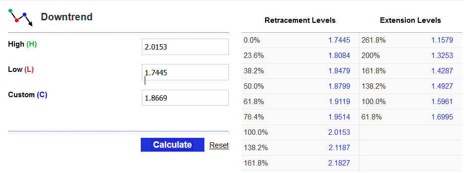 Once the bullish retracement is over and the price has resumed the original downtrend, input the highest value of the bar which reversed and resumed the downtrend in the Custom (C) field. Then click on "Calculate" again to find the Fibonacci extension levels. There is no surefire way to know at which Fibonacci extension level the downtrend will end. However, if you follow your trading strategy that has some sort technique to follow a trend, like a two-bar stop loss method, you will be able to keep the bulk of the movement from the trend as your profit.