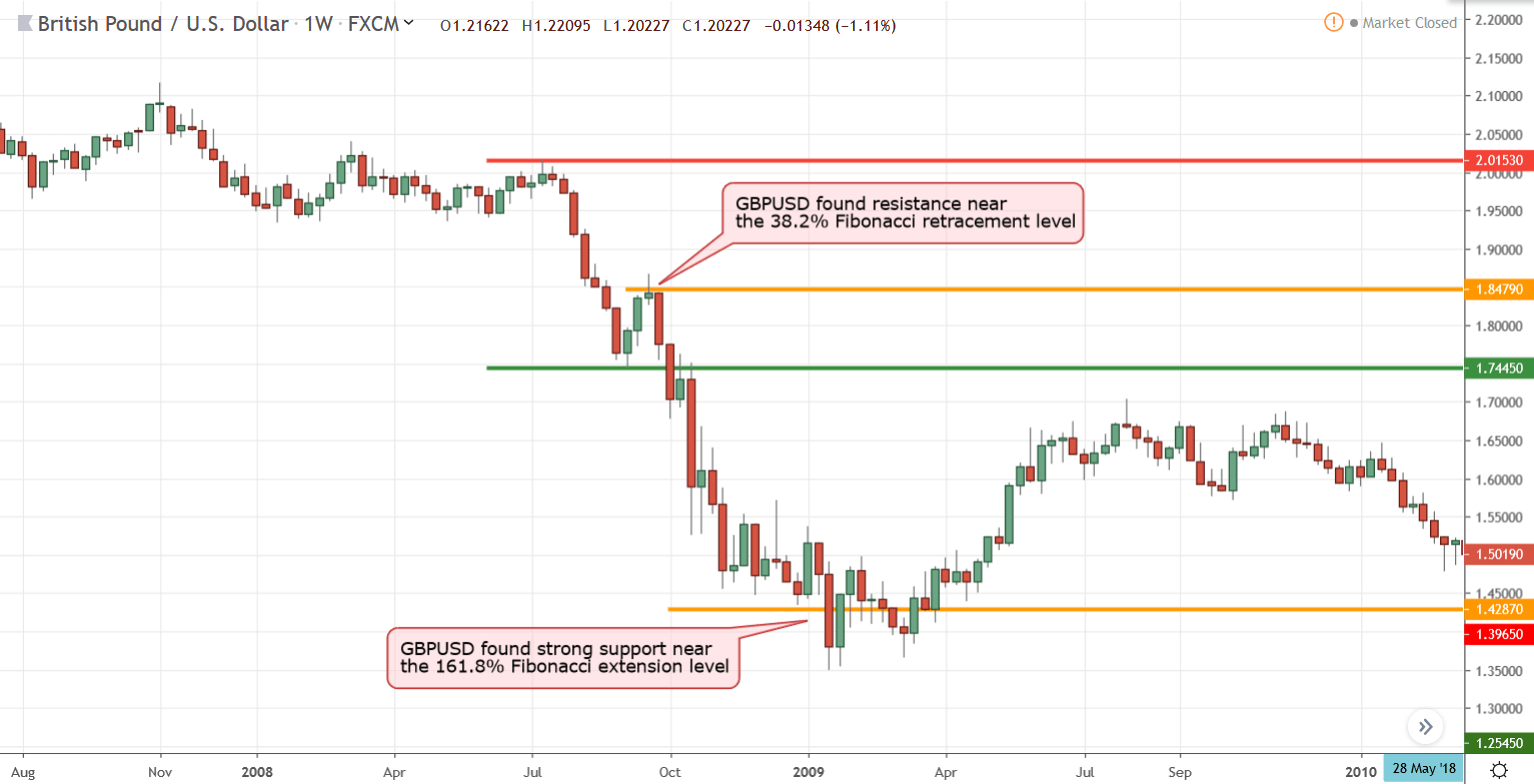 In figure 5, we have plotted the high and low of the GBPUSD downtrend that we calculated in figure 4. As you can see, the bullish retracement found a strong resistance near the 38.2% Fibonacci retracement level at 1.8479. Once the downtrend resumed, it gained bearish momentum and fell to the 161.8% Fibonacci extension level at 1.4287, which we calculated based on the high of the retracement at 1.8669.