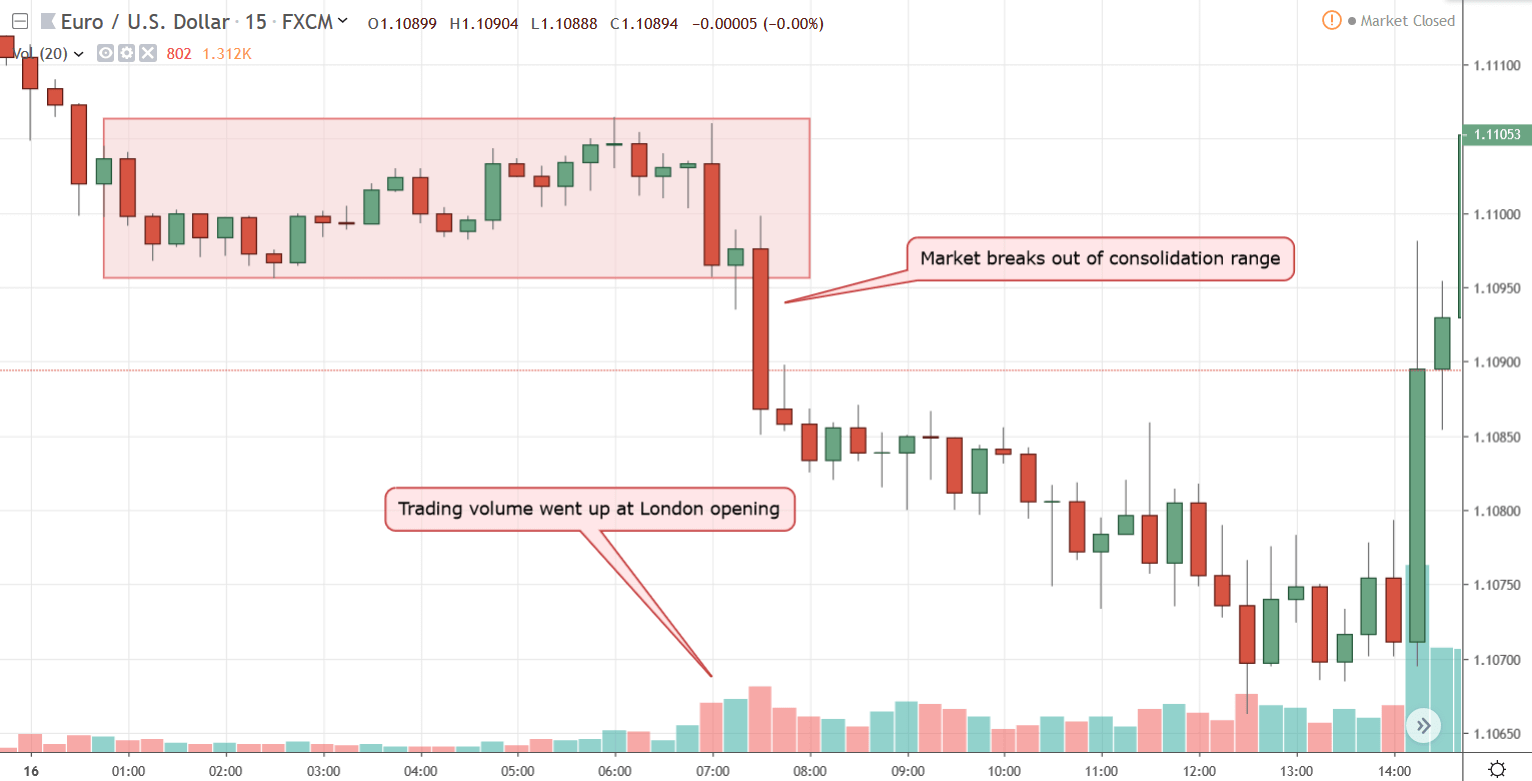 In figure 4, we can see that the EUR/USD was mostly trading within a narrow range and the trading volume was relatively low. But, as soon as the market opened at 8:00 a.m. in London time, the trading volume spiked up and within 30-minutes the EUR/USD broke below the consolidation zone, starting a sustained downtrend in the market.