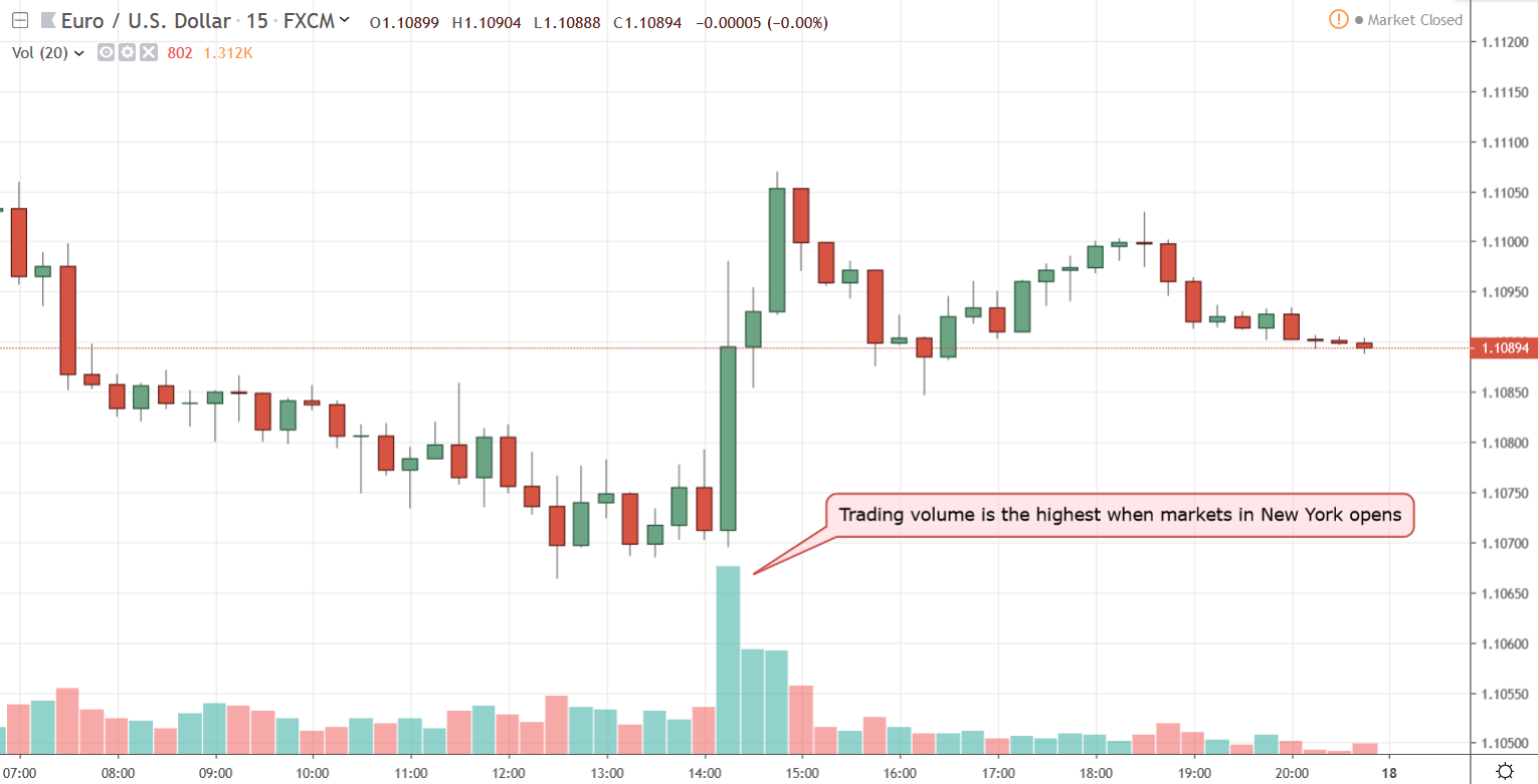 As we discussed earlier, when the market in New York opens, the London trading session has already progressed halfway for the day. As a result, the trading volume in the Forex market typically reaches the highest during the day at the opening hours of the New York trading session.