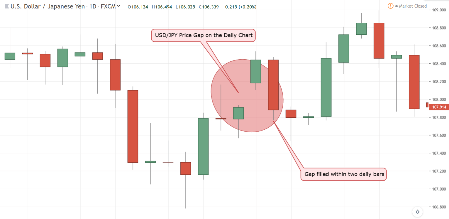 In figure 3, we can see that the USD/JPY price opened much higher on Monday, July 3, 2019, at 108.18 compared to the closing price on Friday, which was 107.91 on June 28, 2019. While the uptrend continued throughout Monday, a bearish retracement started on Tuesday, July 2, 2019, and the gap was filled before the uptrend resumed.