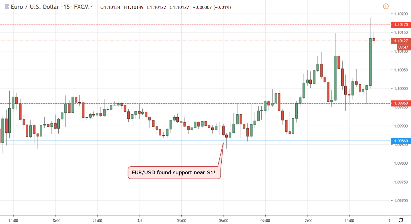 If you still have doubts about how effective pivot points are, take a look at figure 4 that shows how the EUR/USD price reacted when it fell near the S1 level. On the 15-minute chart, we can clearly see that the EUR/USD tested the 1.0986 level several times, failing to do so and moving up in the process.