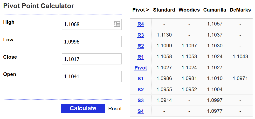 As you can see in the table on the right, once you click the calculate button (blue), it will display all the pivot points as well as the support and resistance levels for the four different variants of pivot points.