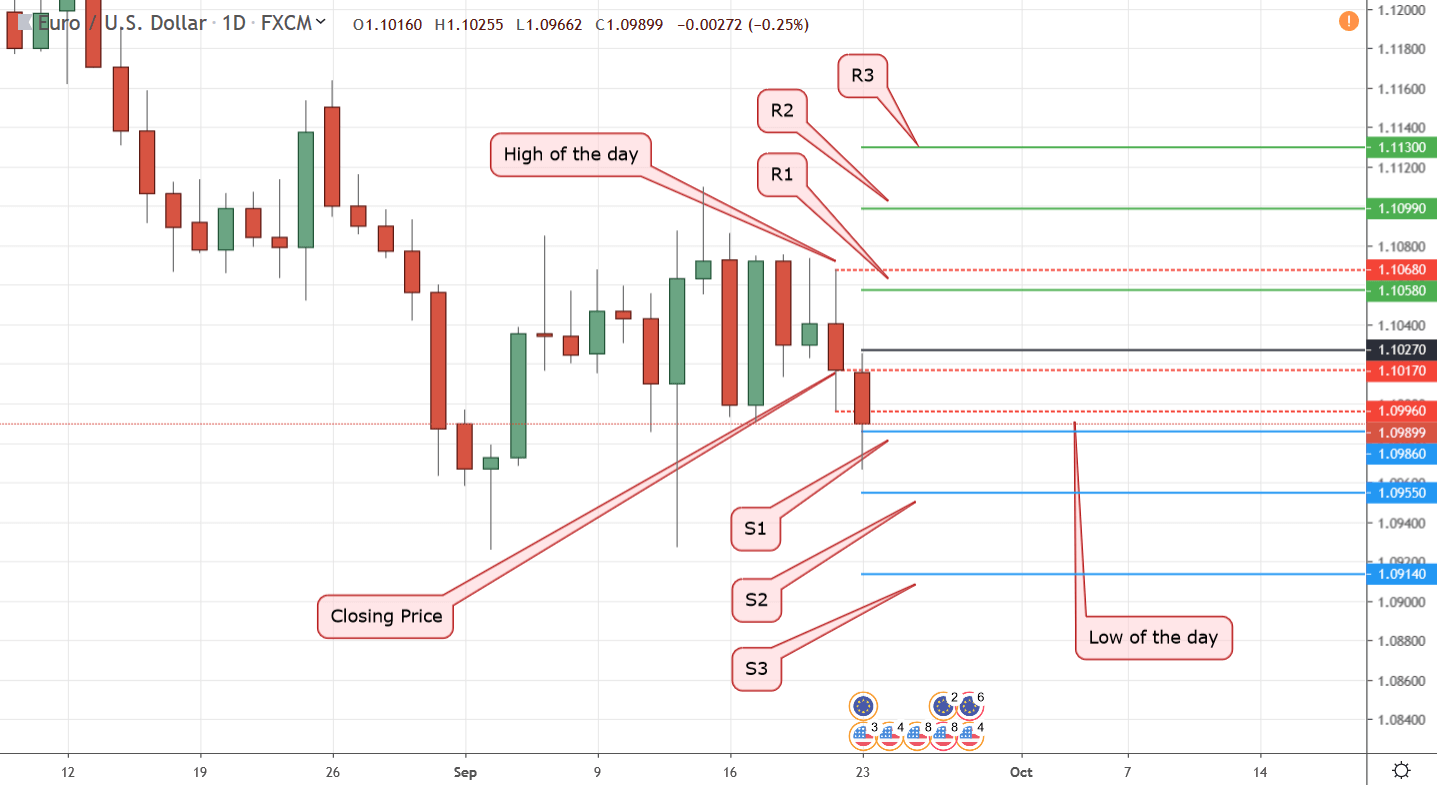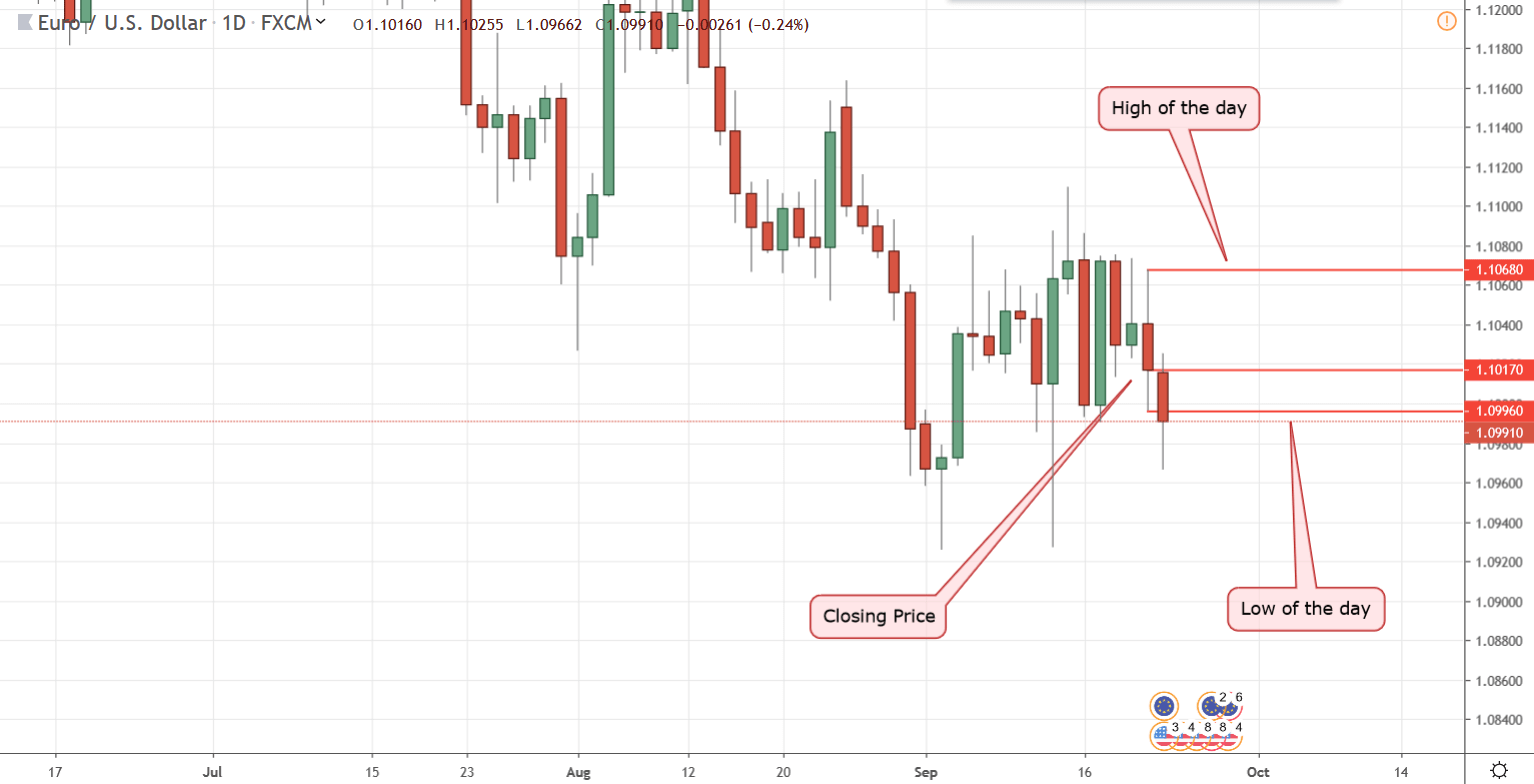 In figure 1, we can see the EUR/USD's High, Low, and Closing prices of the previous day's candlestick. Using the formula stated above, the pivot point for the next day would be: